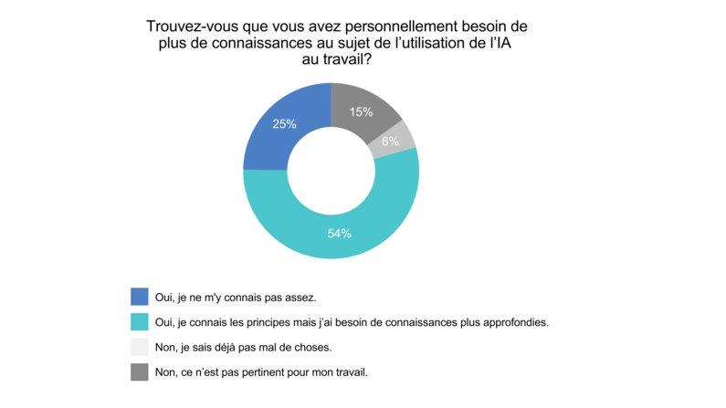 80% des professionnel-le-s indiquent avoir besoin de plus de connaissances et de compétences afin de pouvoir utiliser efficacement l’IA dans leur travail quotidien. Ce besoin est particulièrement ressenti par les personnes occupant des fonctions inférieures. Elles sont nombreuses à se sentir seules face à l’intégration de l’IA dans leur travail.
