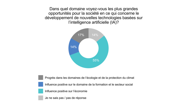 Les métiers de la connaissance sont davantage concernés par l’intelligence artificielle (IA) dans le monde du travail. L’attitude à l’égard de l’IA dépend en outre dans une large mesure de la fonction professionnelle et du niveau de formation: alors que les personnes occupant des fonctions cadres et disposant d’un diplôme de l’enseignement supérieur voient de grandes opportunités dans l’utilisation de l’IA, notamment pour l’économie, celles qui sont moins bien formées sont plus sceptiques. En parallèle, les scénarios relatifs aux effets négatifs de l’IA sur la société trouvent un plus grand écho auprès des personnes mieux formées.