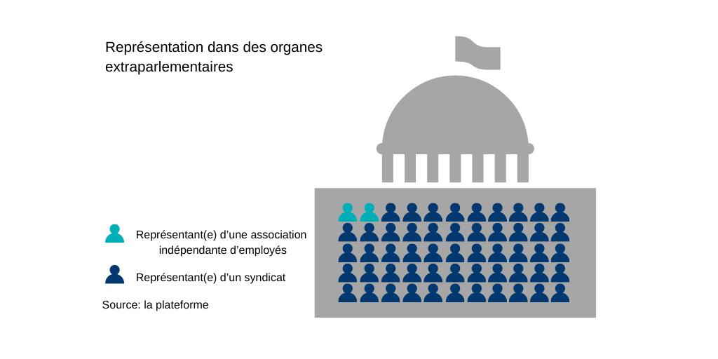 Depuis sa création, la plateforme s’engage pour une bonne représentation de la population active au sein des organes extraparlementaires au niveau fédéral. La répartition actuelle des sièges ne reflète pas suffisamment l’hétérogénéité des employés en Suisse. L’enquête de la plateforme révèle que les personnes actives sont tout aussi nombreuses à être membres d’une association indépendante d’employés que d’un syndicat.